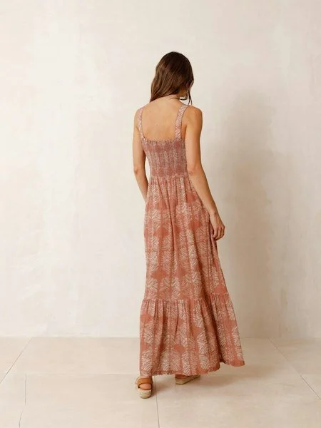 Super light long dress with smock detail in organic cotton in subtle vintage rose print